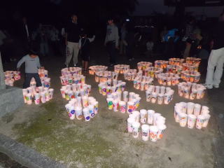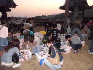 | 灯りまつりは、毎年、10月(例年第2土曜日)尾道市が尾道繁栄の礎を現代に再現し、ほのかに灯るぼんぼりを通して“癒しのまち尾道”のぬくもりを体感しようとするものです。 本校の児童も将来の夢や願いを描かれたぼんぼりを、済法寺へと続く参道や境内に、ええじゃん灯りまつり係を中心に、先生・保護者・児童達の手によって、奉納設置しました。 今年は、3月11日に発生した「東日本大震災」で犠牲になった方々に追悼の灯りをともす気持ちを込めて、参道の石段の踊り場には、「絆」という文字がぼんぼりによって描かれました。 |