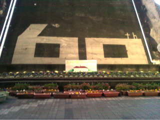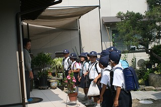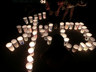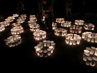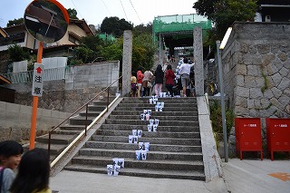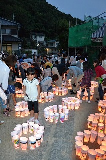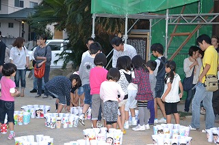 | 風が気持ちよくなってきた秋の日、今年も児童が2個ずつ書いた灯ろうが、済法寺の境内と石階段に、灯りまつり係が中心となって、PTA・児童の手で並べられました。段々と暗くなっていく中、灯ろうに点灯され、作られた『和』の文字とたくさんの円が、暗闇の浮かびあがりました。 |