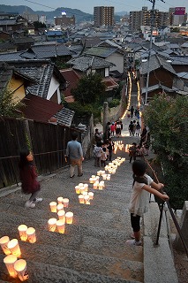 | 【灯りまつりの由来】 尾道は1169年に開港した港とともに発展してきました。海岸沿いやお寺、参道にはには常夜灯(燈明)があり、買積みの船・北前船はそれらの灯りをめざして入港してきたといわれています。尾道灯りまつりは、そんな尾道繁栄の礎を現代に再現し、市内で約30,000個の灯りがつけられます。 江戸後期から明治初期頃、薬師浜を会場に灯ろう流し(浜せがき)がお盆送りの行事として始められ、最盛期には尾道水道に数千の灯りが浮かんだといわれています。灯ろう流しは、昭和の中頃まで続きましたが、環境問題等の理由により中止されました。 当時の模様を懐かしむ人も多く、今から10年前(平成14年)、商工会議所や尾道市立大学の協力により、妙宣寺と艮神社の境内に灯ろうのライトアートが灯されました。これが、尾道の秋の一大イベント「尾道灯りまつり」の開催のきっかけにもなりました。 |