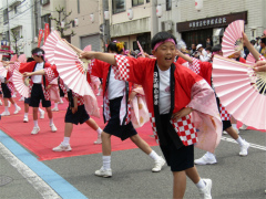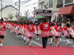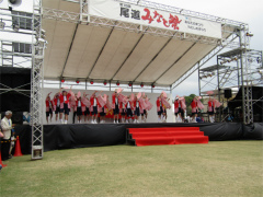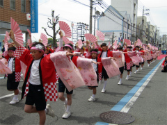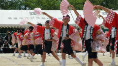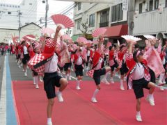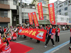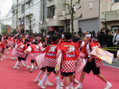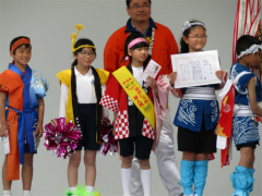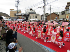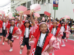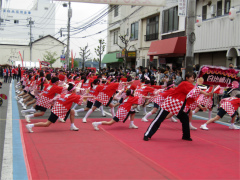 | ・日比崎小学校5年生「桜ふぶきひびっこ隊」が出場しました。 子ども達は2月から練習を重ね、その練習の成果を見事に実らせ、昨年に続き銅賞を 受賞しました。 今年の衣装は、金色の桜を咲かせた袖の前面に、自分達の意気込みを言葉や絵で 表現しました。観客からの声援をバックにレッドカーペット上を、元気いっぱいの かけ声と満開の桜のような笑顔で踊りを披露しました。(広報誌ひびざき抜粋) |