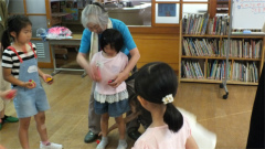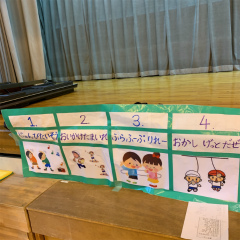 | ・ミニ運動会 1.準備運動 こんちゅうたいきょくけん 2.おいかけ玉入れ(青対黄 赤対緑) 3.親子リレー・フラフープリレー 4.お菓子ゲットだぜ |