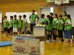 | 残暑の厳しい中、教職員・保護者で結成されたチームで大会に出場しました。 第1試合は、瀬戸田中学校に49対44で惜しくも敗れ、第2試合は向島中央小学校に 54対44で敗退しました。 残念ながら試合で勝利することはできませんでしたが、チームワークの良いプレーに 応援席も熱が入りました。 選手の皆さん、交流委員の皆さん、大変お疲れさまでした。 (広報誌より) |