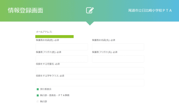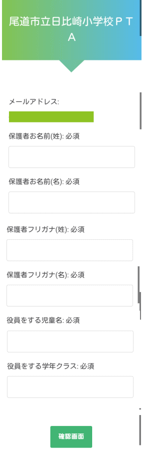 | ⑤登録内容を入力 ・保護者姓 ・保護者名 ・保護者姓カタカナ ・保護者名カタカナ ・役員をする児童名 ・役員をする組クラス ・所属する宇委員・係等をすべて チェック ⇒確認画面クリック |