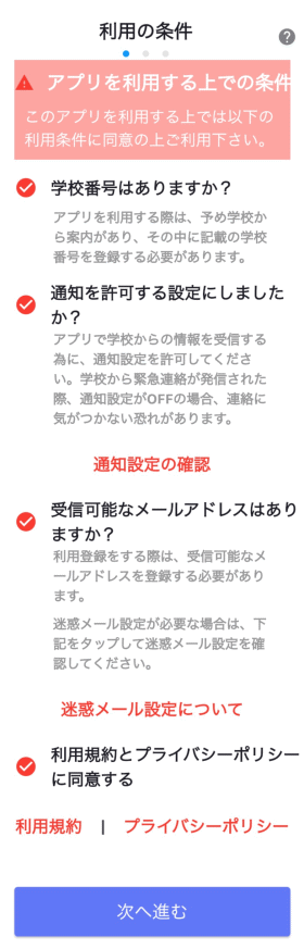 | ④利用の条件 ○学校番号はありますか? ○通知を許可する設定にしましたか? ○受信可能なメールアドレスはありま すか? ○(迷惑メール設定) 利用規約とプライバシーポリシーに 同意する 読んで、4つともチェックを入れる ⇒次へ進む |
