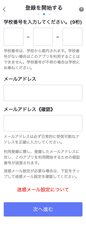 | ⑤・学校番号 ・メールアドレスを入力 ⇒次へ進む |