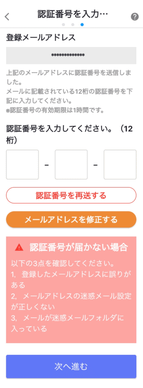 | ⑥ メールで届いた認証番号を入力 ⇒次へ進む |
