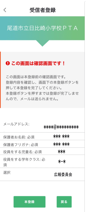 | ⑦受信者登録 ・保護者姓 ・保護者名 ・保護者姓カタカナ ・保護者名カタカナ ・役員をする児童名 ・役員をする組クラス ・所属する宇委員・係等をすべて チェック ⇒確認画面クリック |